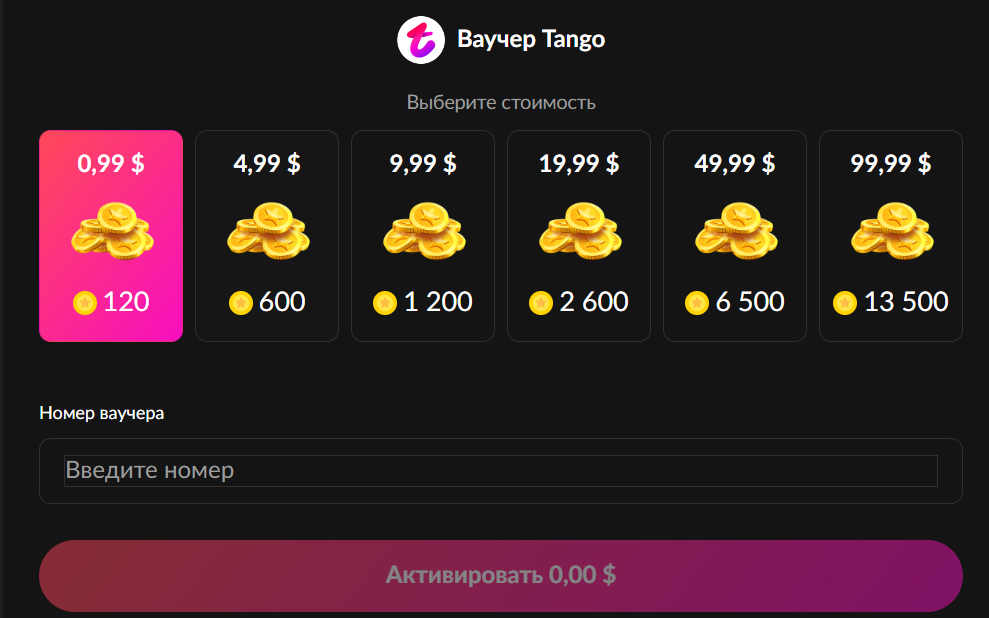 Зашёл в приложение или открыл tango.me/voucher